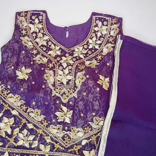 Pakistani/ Indian Girls Dress || Off White Banarsi Sharara and Purple Shirt Embellished with Golden Gota and Moti Handwork || Wedding Wear