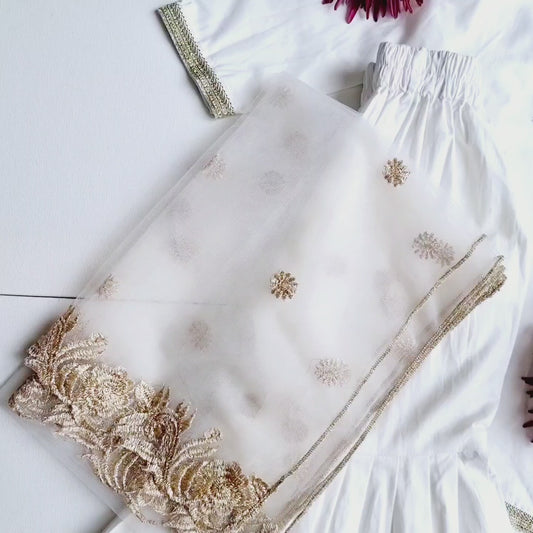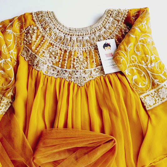 Girls Embroidered Tilla-work Frock With Trouser and Dupatta Set