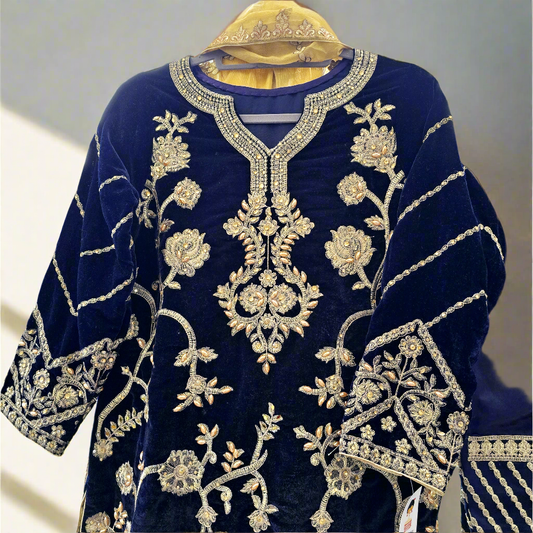 Eid Collection Velvet Navy Blue Outfit Pakistani Partywear Shalwar Kameez